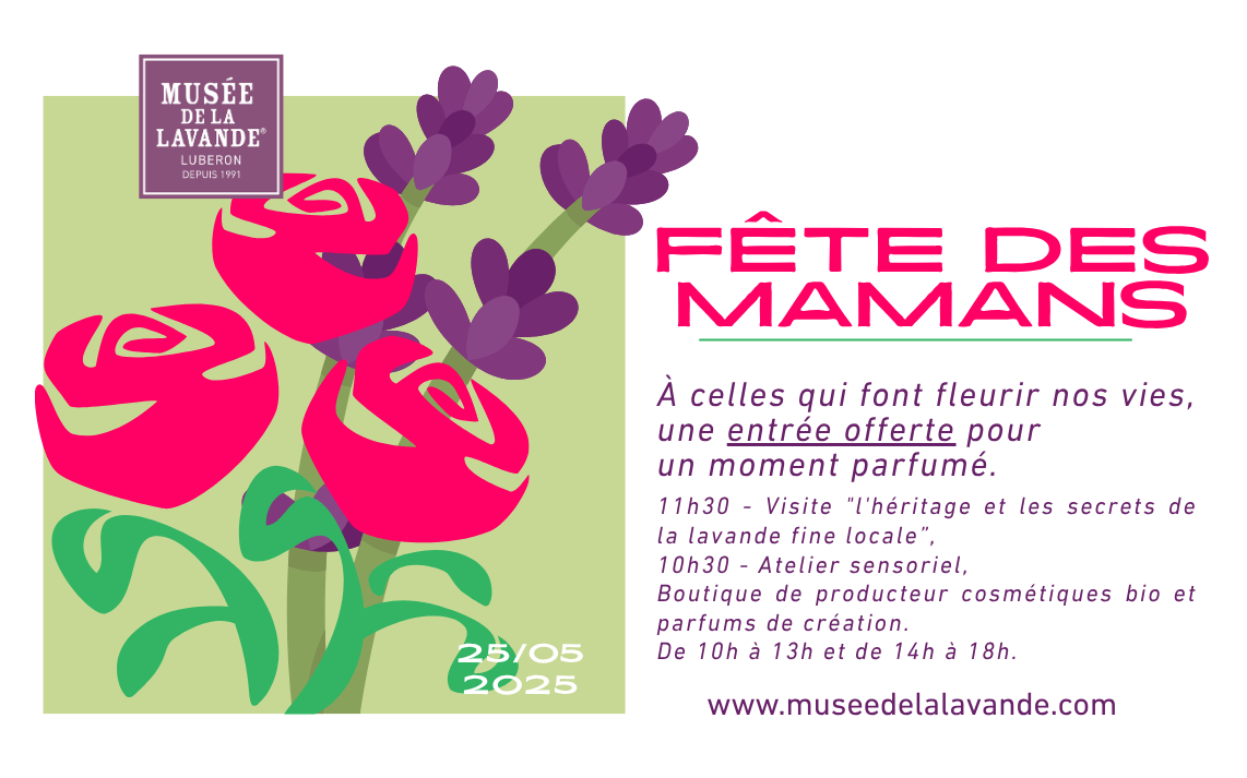 À celles qui font fleurir nos vies, le Musée de la Lavande Luberon rend hommage en beauté pour la Fête des Mères. Au cœur du Vaucluse, entre traditions et senteurs de Provence, une entrée gratuite est offerte à toutes les mamans, pour une escapade sensorielle inoubliable.